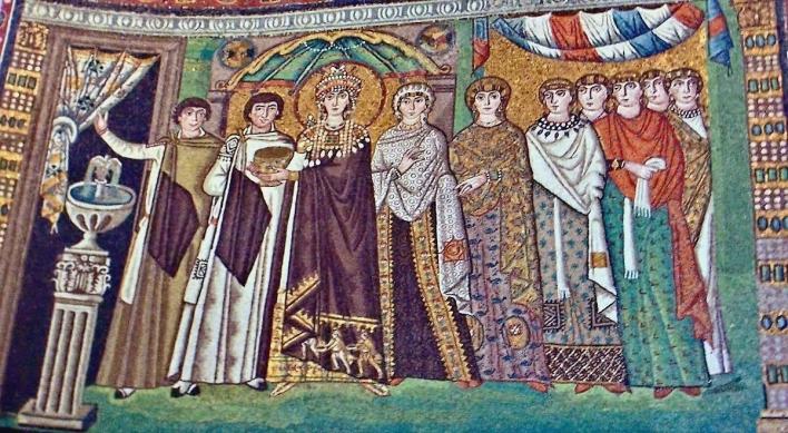 Την εποχή της κυριαρχίας των Βυζαντινών έγιναν αλλαγές σε ορισμένες μωσαϊκές παραστάσεις. Ενώ δηλαδή στο βόρειο και νότιο τοίχο εικονιζόταν ο Θεοδώριχος με την αυλή του και τη βασίλισσα, οι παραστάσεις αντικαταστάθηκαν την εποχή του Ιουστινιανού με δύο πομπές μαρτύρων.
