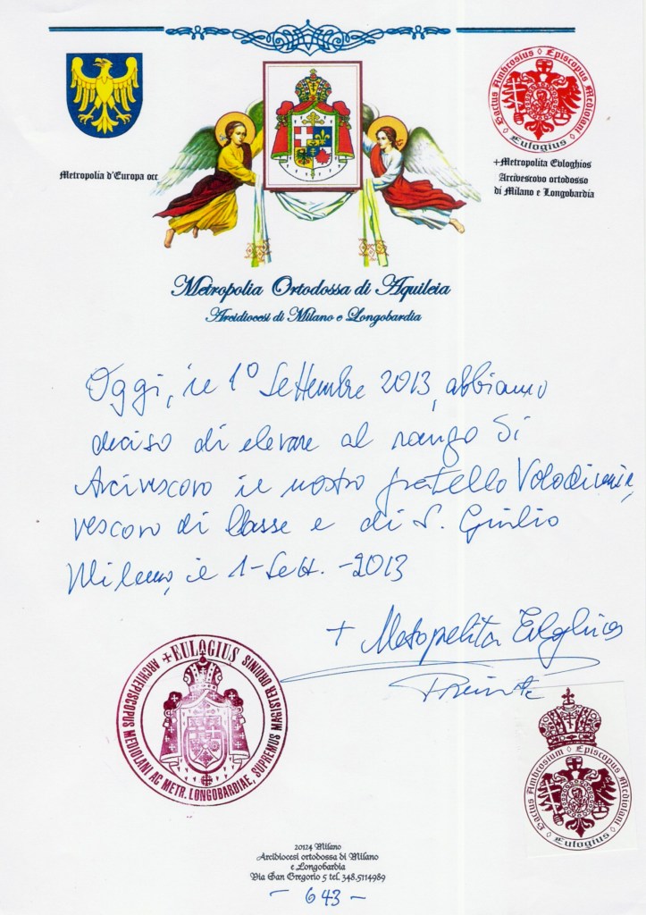• SUA BEATITUDINE BASILIO E LA CHIESA ORTODOSSA D’ITALIA
