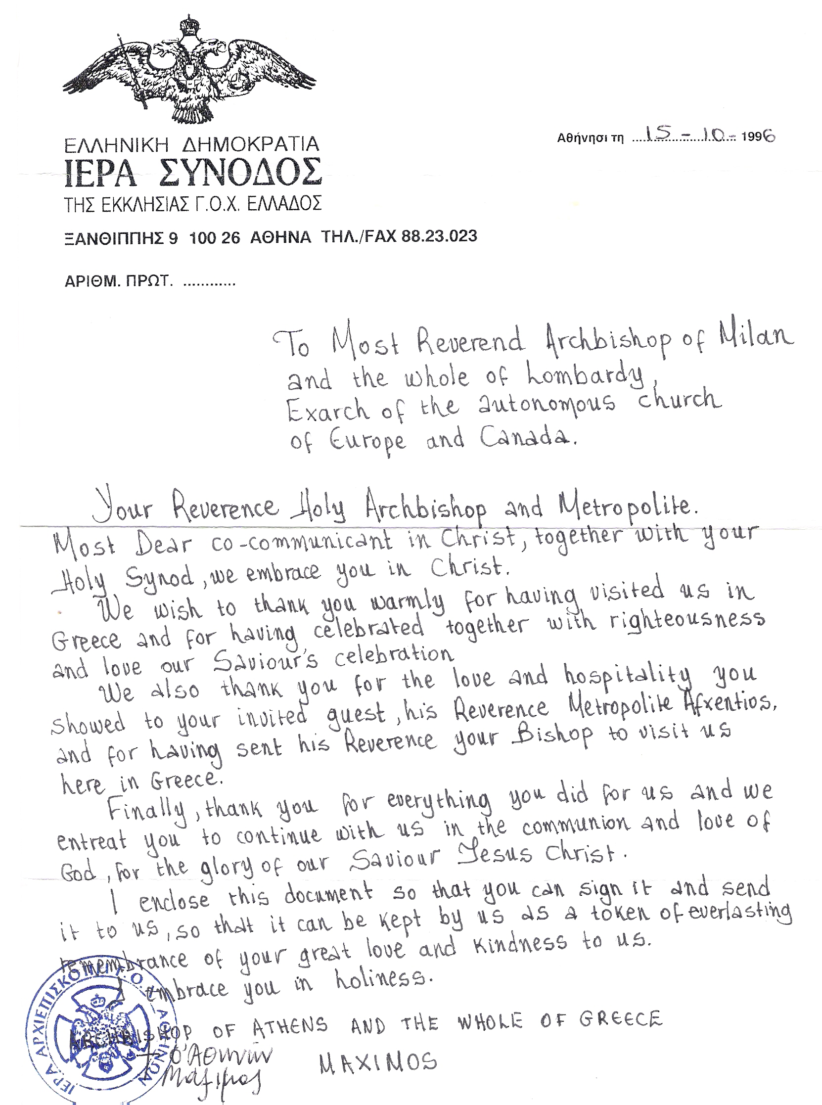• Letter of the late Abp. Seraphim of Chicago to Auxentios (1972)