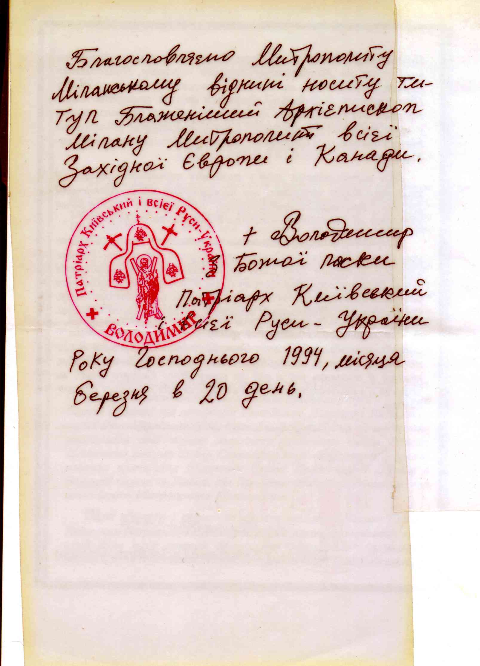 • АВТОНОМНА ПРАВОСЛАВНА ЦЕРКВА ЗАХІДНОЇ ЄВРОПИ І КАНАДИ - 1993 УПЦ КП-Медіоланського i Святоюлінського Епархiя